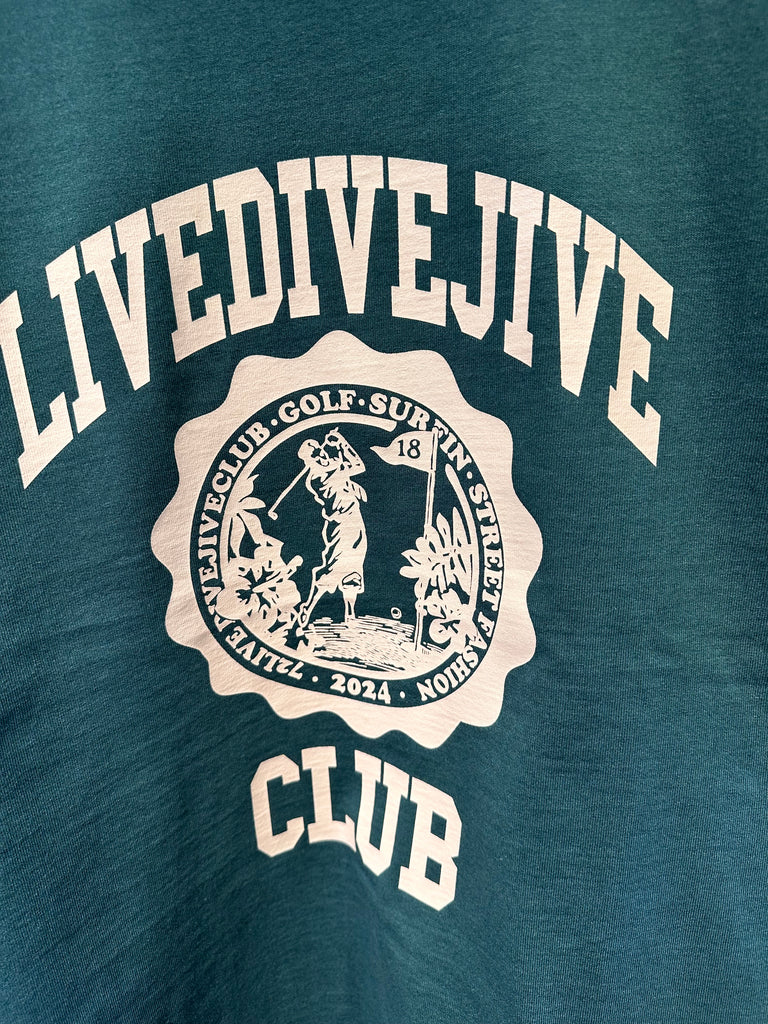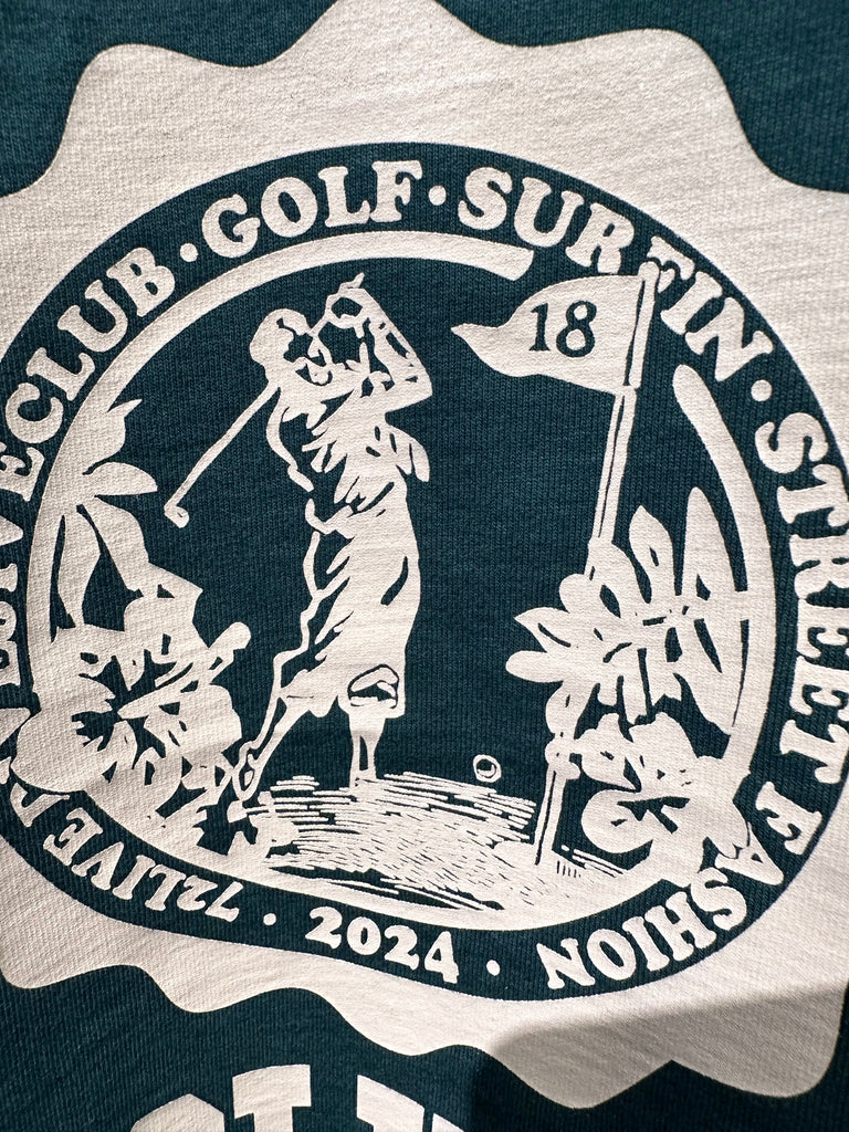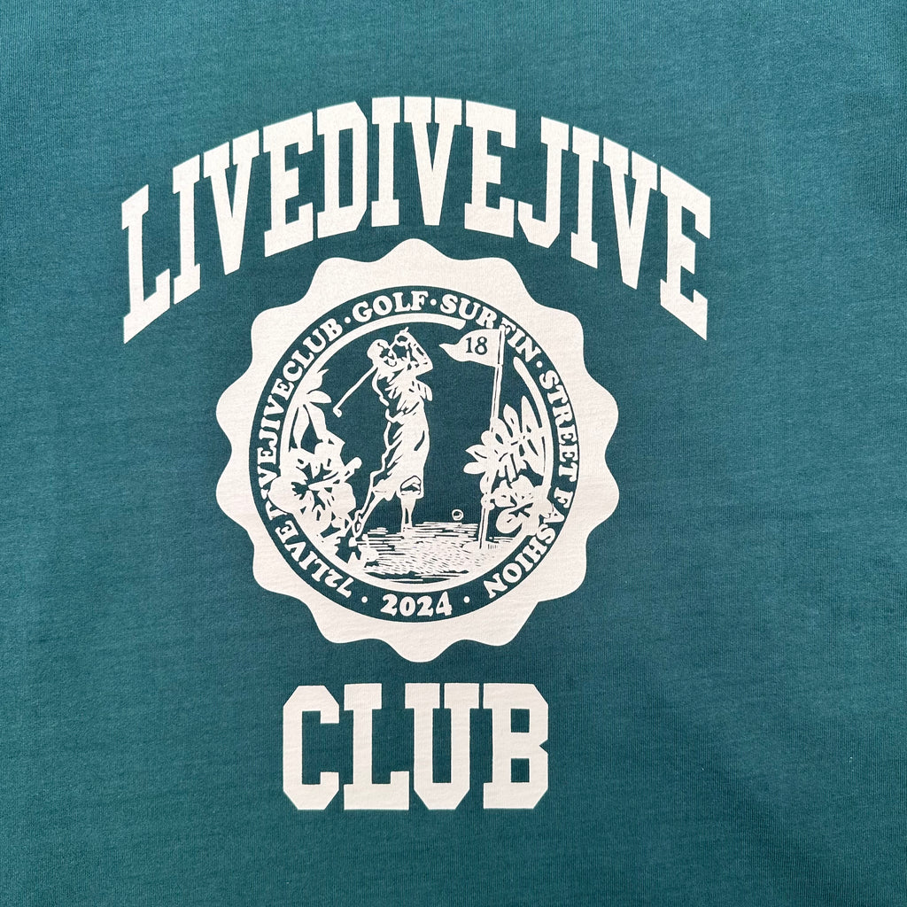 エンブレムのデザインは18Hのピンフラッグにハイビスカスの花やモンステラの葉など配置しハワイアンテイストに仕上げた72LIVEDIVEJIVECLUB の college Tee。