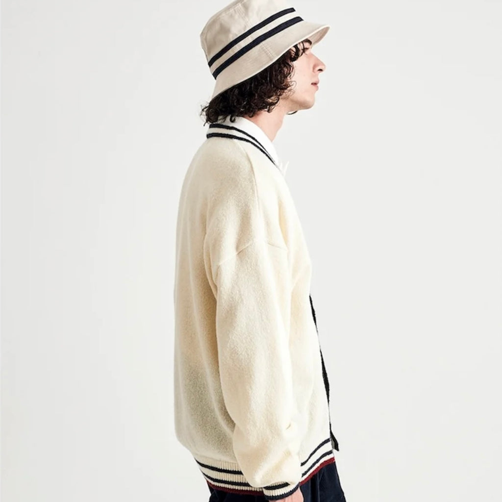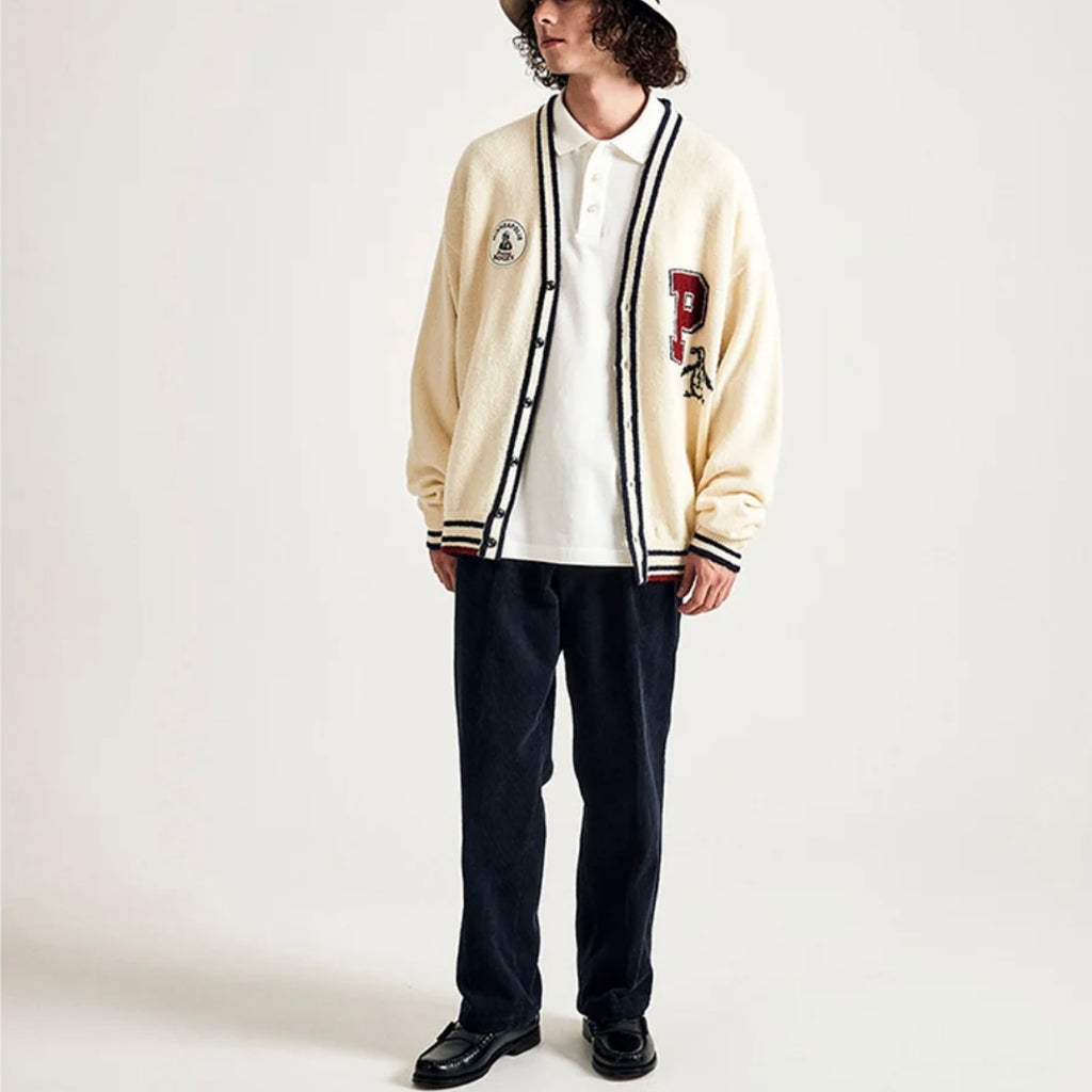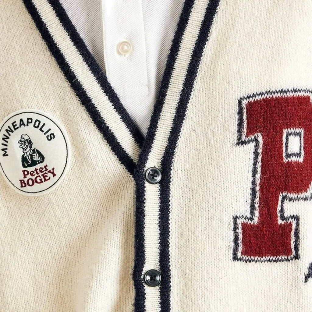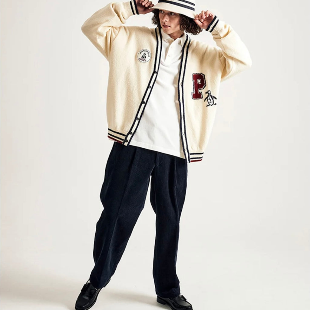 ・配色ラインやワッペンの組み合わせがプレッピーなカーディガン。