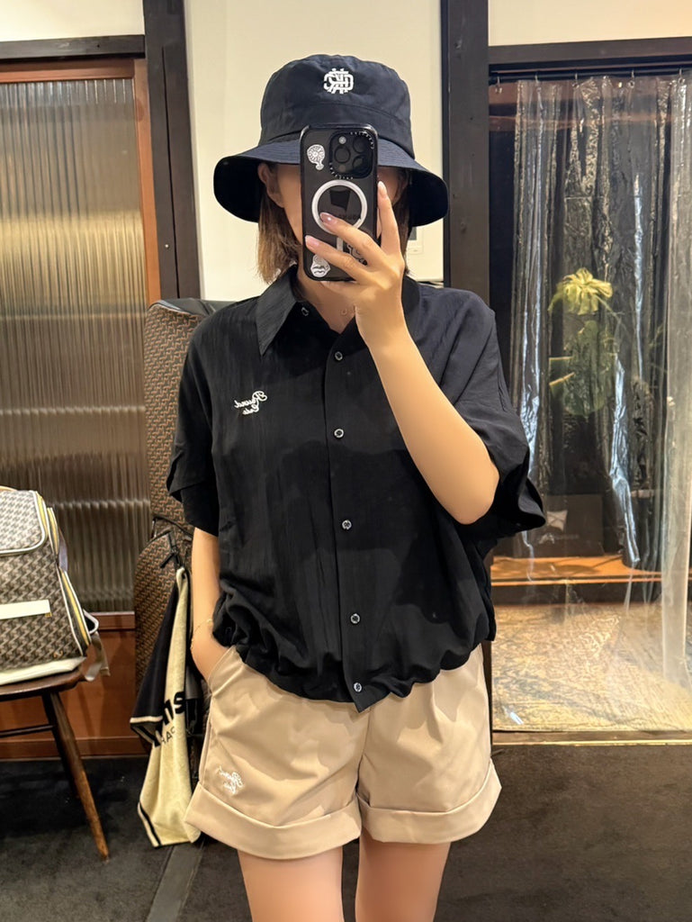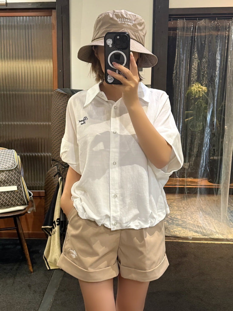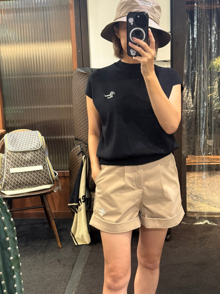 少し光沢感のある生地にワンポイントで刺繍をあしらった上品なショートパンツ